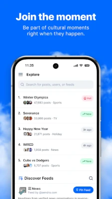 Choose from thousands of community-built feeds covering news, art, pets, science, fandom, investing, culture, and everything in between. Stay updated with people you care about in your Following feed, or dive into new perspectives and trends in Discover.