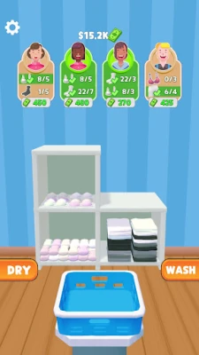 Pick up dirty clothes, wash in the washing machine and dry them on the street. Challenge yourself on time management. Keep an eye on time, don’t let any customer get angry at your laundry store.
