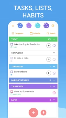Create your own schedule and routine by adding tasks - type them or use voice input, add subtasks with checkboxes, tags, attachments, notes, reminders and importance. Mark items as completed with just one tap and track your progress and productivity!