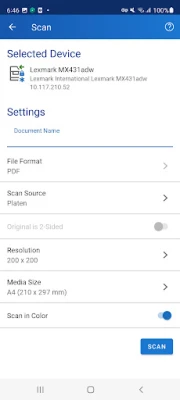 -Scan documents from your MFP wirelessly from within the app